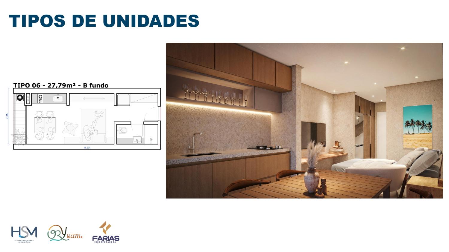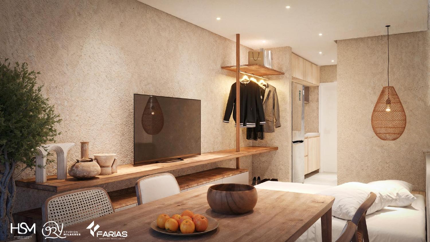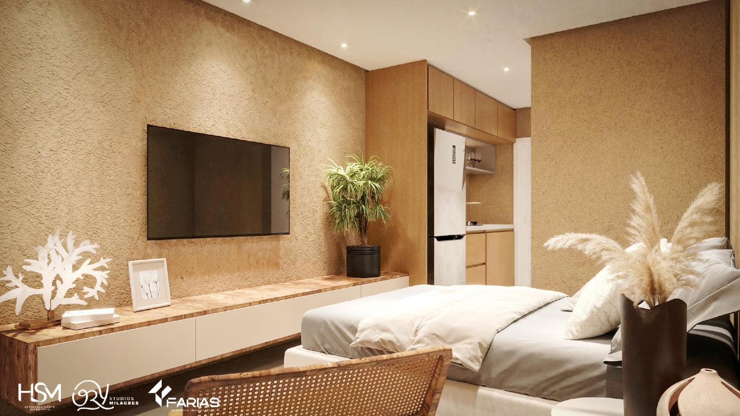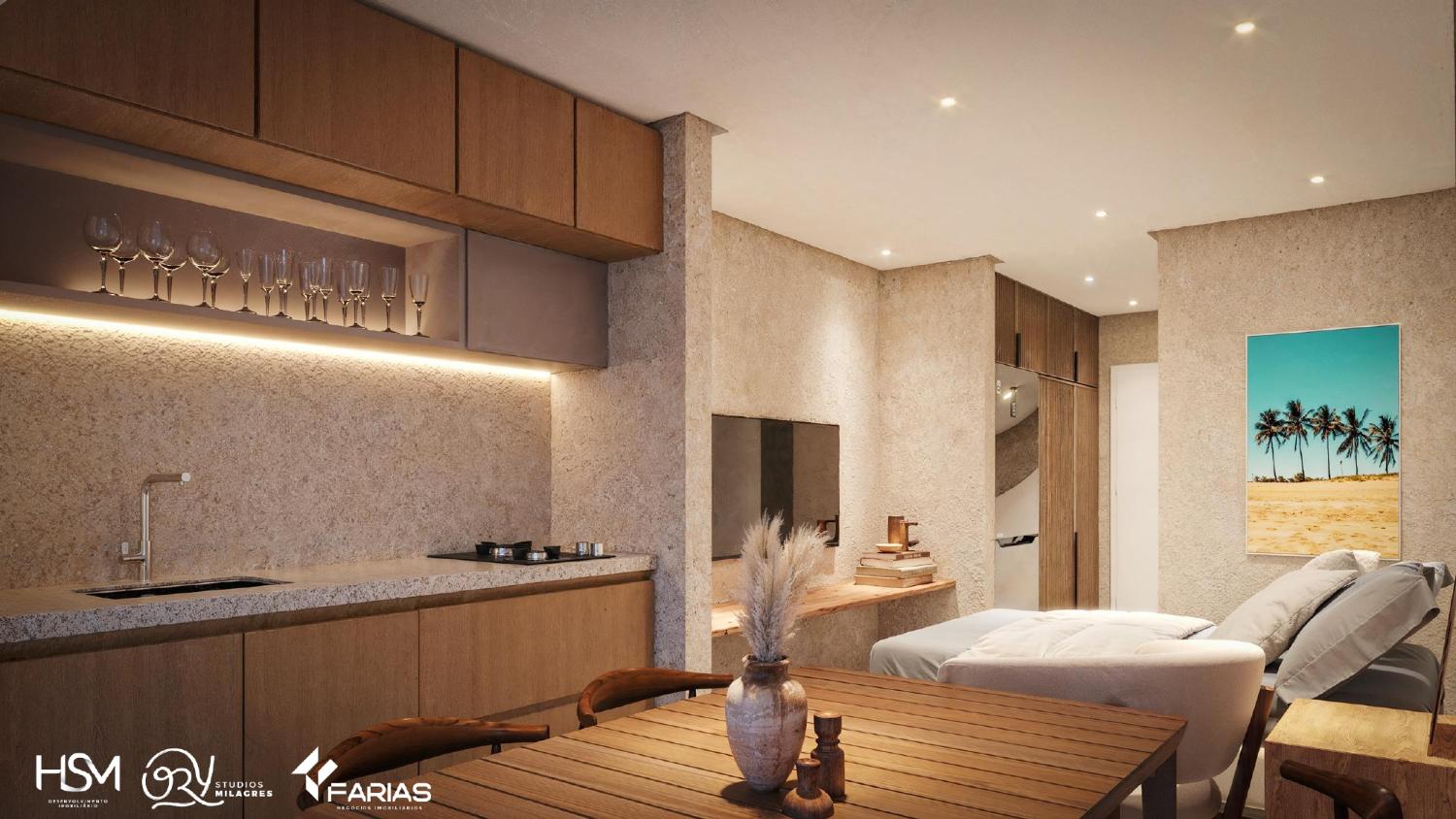 Apartamento beira-mar, com quarto, sala, cozinha e banheiro, em condomínio com área de lazer completa.